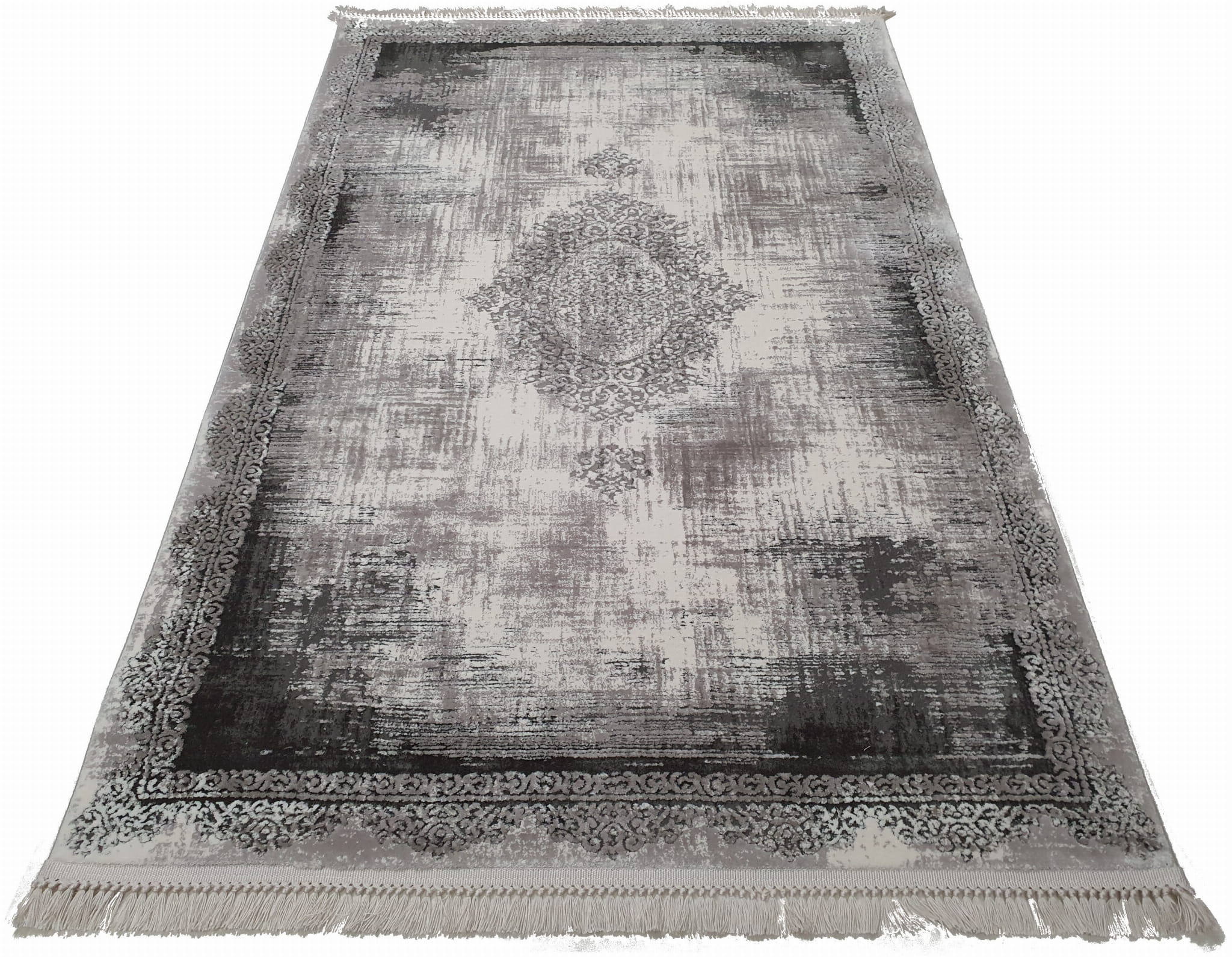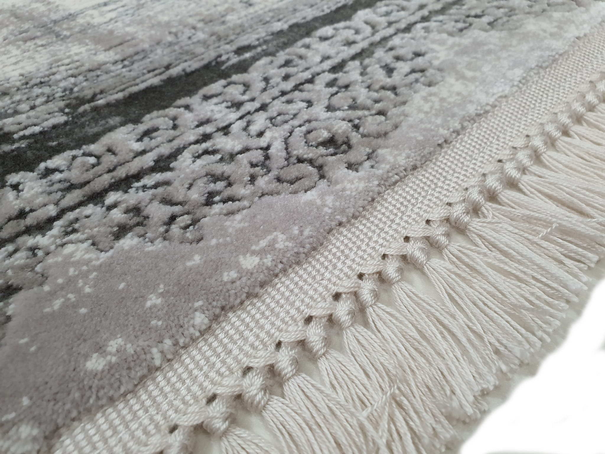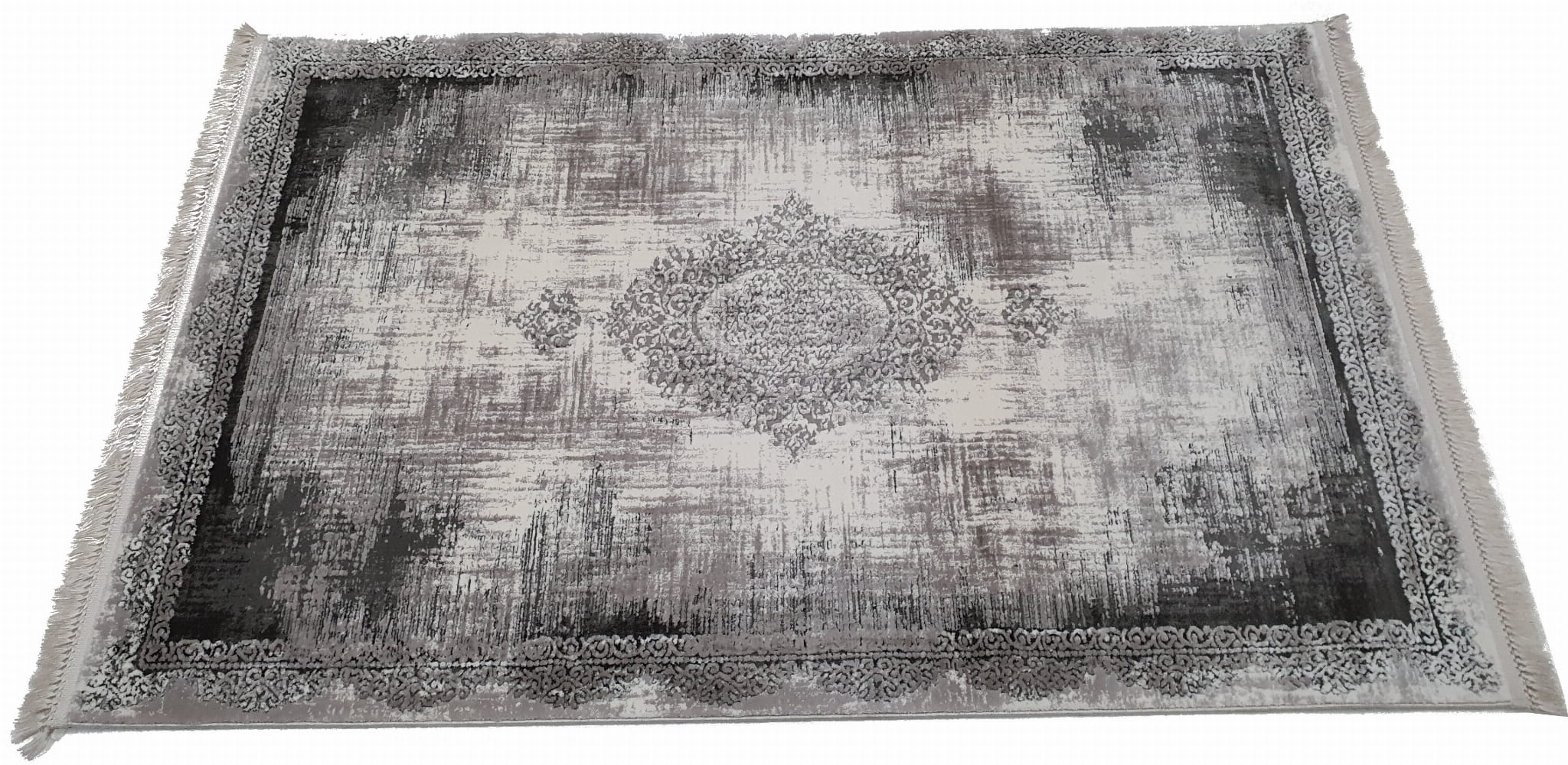 Bardzo gęsty dywan o dwupoziomowej strukturze runa postarzany w stylu Vintage z frędzlami. Frędzle frędzelki merinos