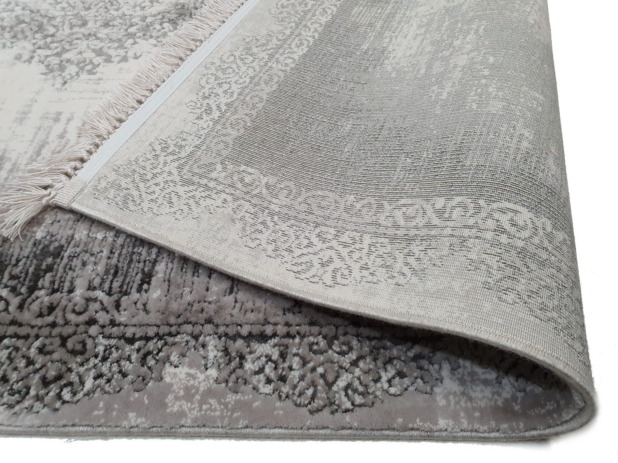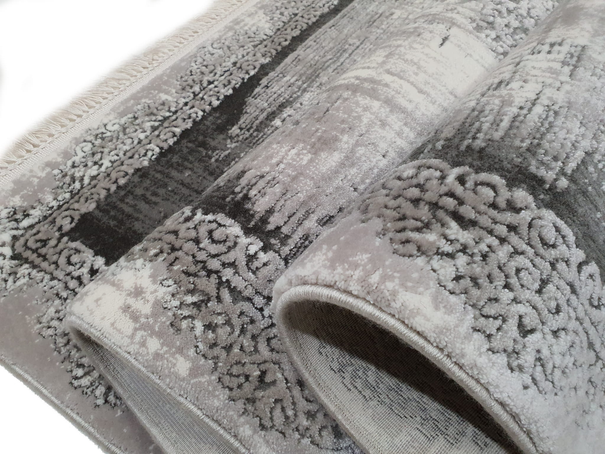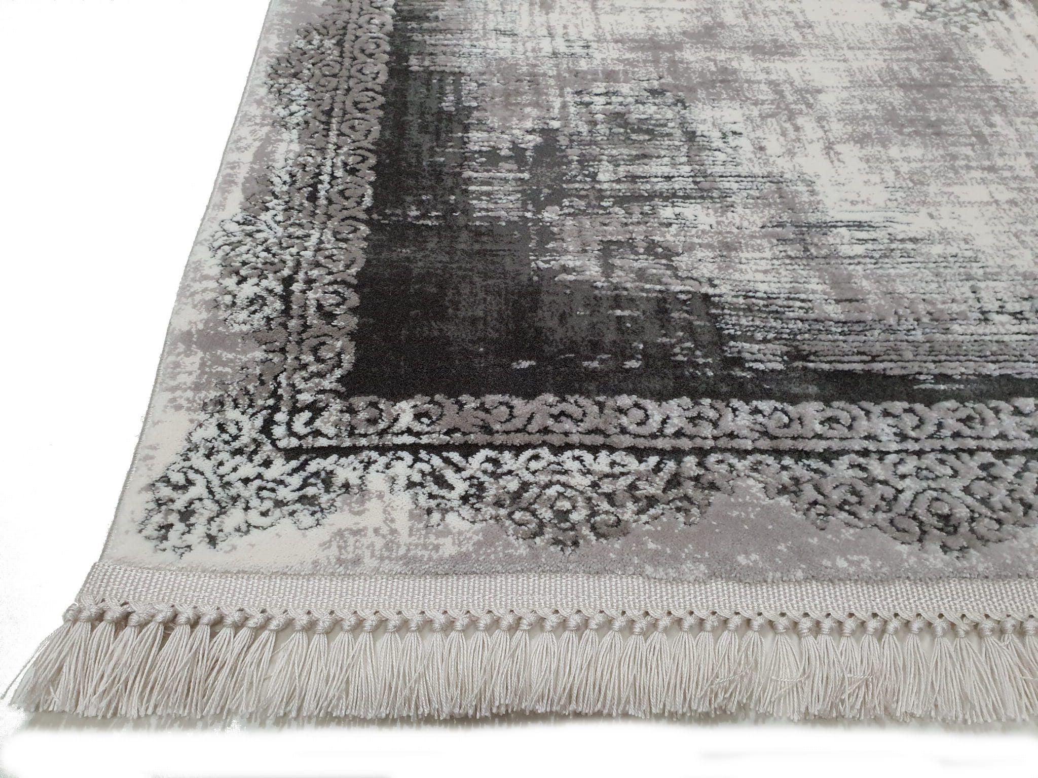 Bardzo gęsty dywan o dwupoziomowej strukturze runa postarzany w stylu Vintage z frędzlami. Frędzle frędzelki merinos